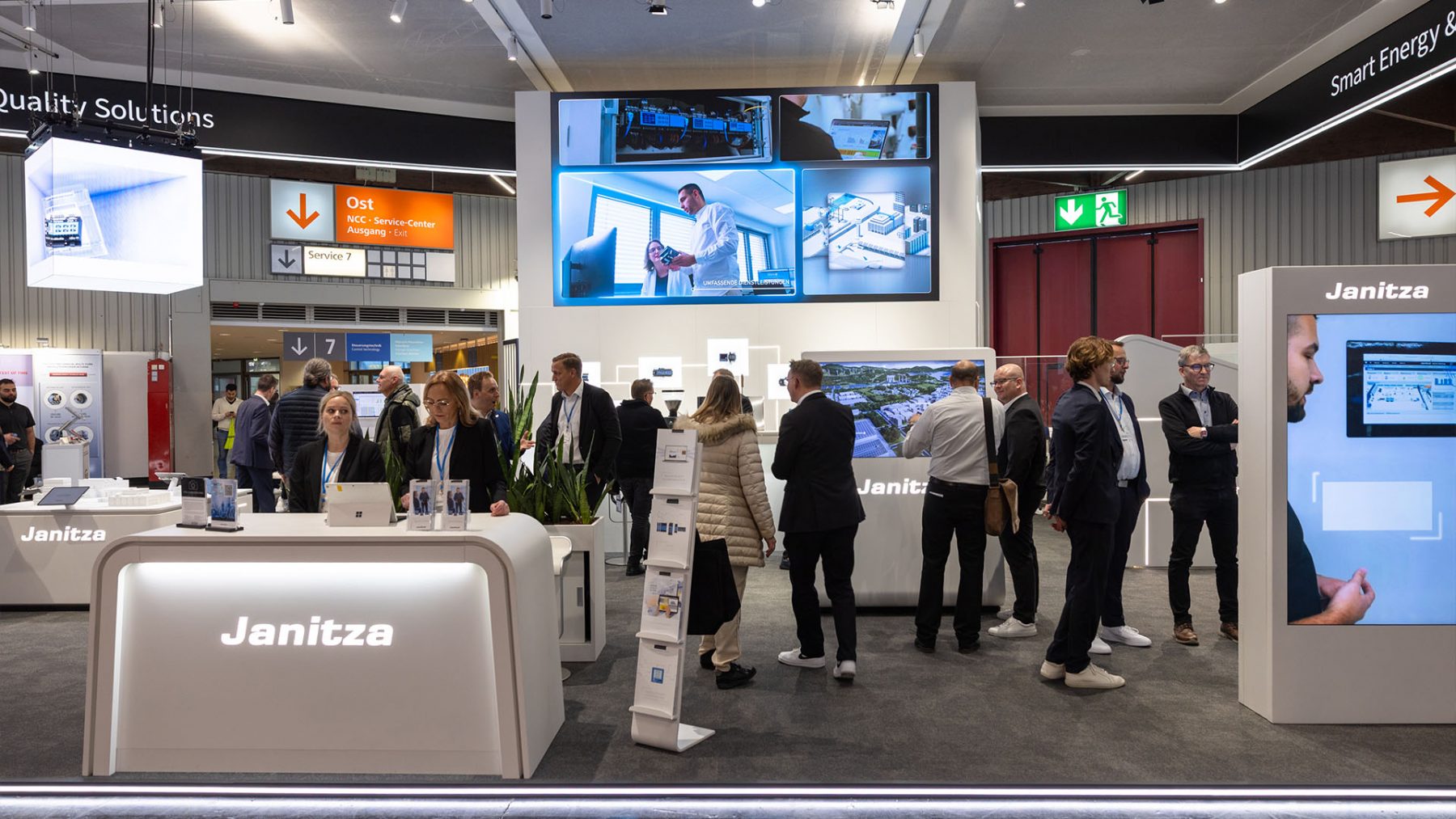 Im Rahmen der SPS realisiert mld die Video- und Medientechnik am Messestand von Janitza. Hierunter fallen zahlreiche Displays mit und ohne Touch in unterschiedlichsten Größen und Ausführungen inklusive entsprechender Zuspieltechnik. Weiterhin kommt eine in die Standarchitektur integrierte LED-Wand zum Einsatz. Neben der visuellen Kommunikationstechnik zeichnet sich mld für die Personenführungsanlage am Stand verantwortlich, mit der Führungen und Erläuterungen zu den einzelnen Exponaten realisiert werden.
